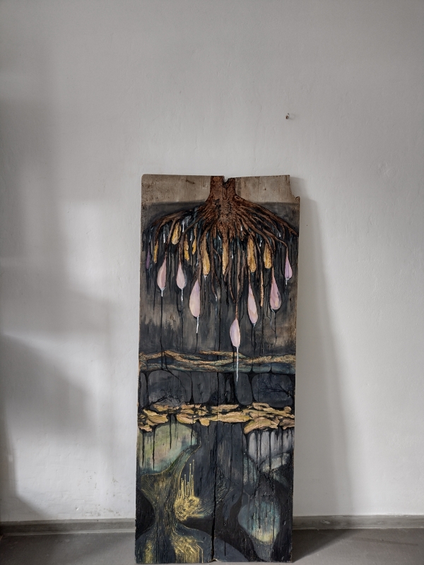 Wood Wide Web: Pohádky o Mykorhíze IV (Umírání a sdílení),2023, vypalovaná dýha, sítotisk, akryl, akvarel, třpytly, lak a zbytky vosího hnízda na dřevěné desce, výška 160 cm