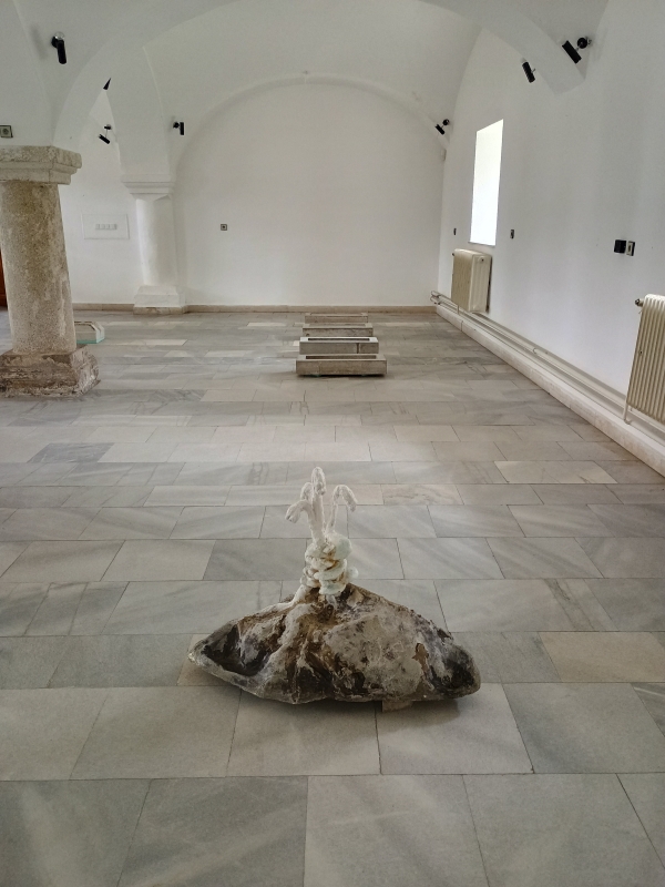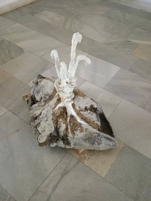 Hnilák, 2024, cement, písek, akryl, biodegradabilní třpytky, včelí vosk, lak na nehty, mech Monotropa, 2024, cement, sand, acrylic, biodegradable glitter, beeswax, nail polish, moss