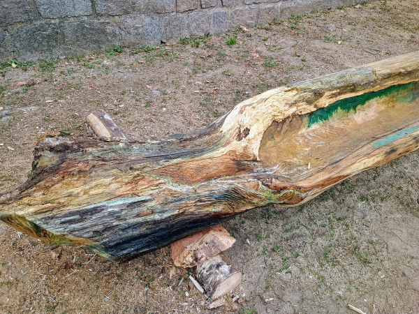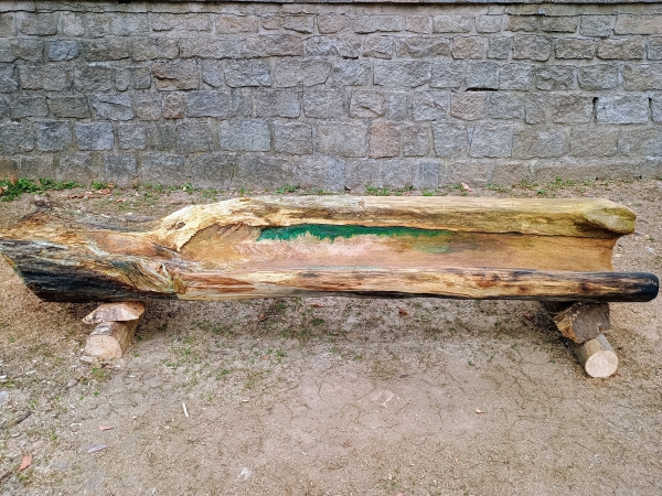 Pocta tlení aka variace na téma lavička na řezbářském sympoziu, dub, airbrush, lněný olej, pigmenty, délak cca 2m, 2024