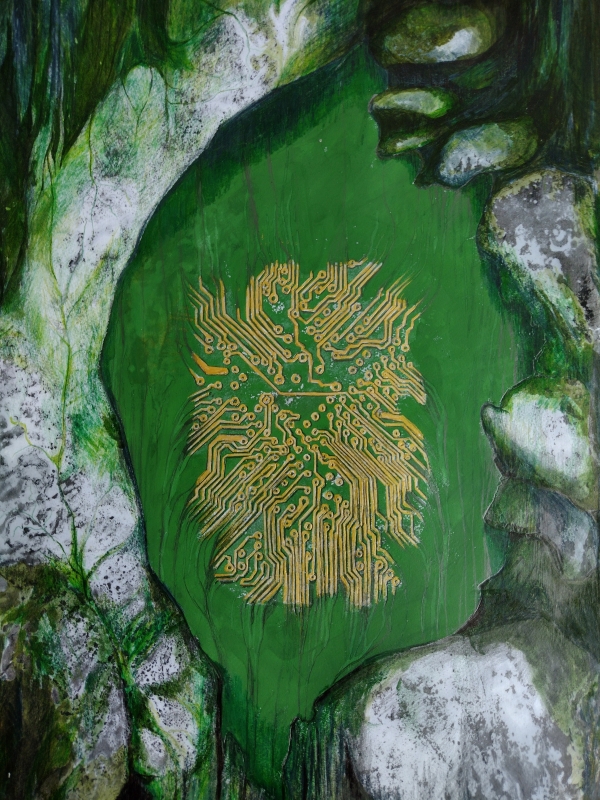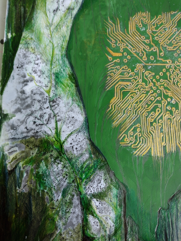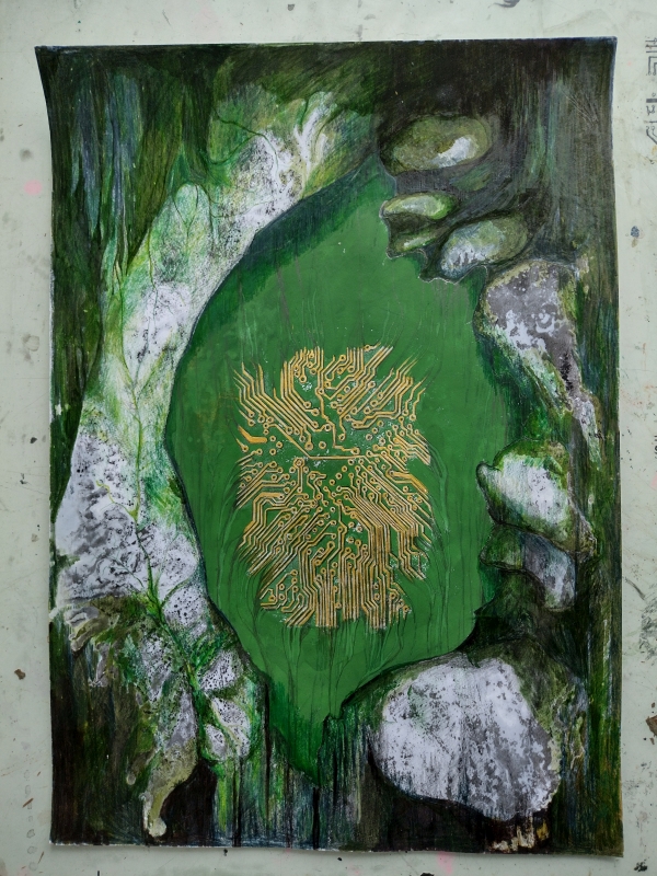 Nectria galligena (Appletree canker), from Wood Wide Web series, 2023, 30x42 cm, ink, paint, wax, pencil, linocut on paper