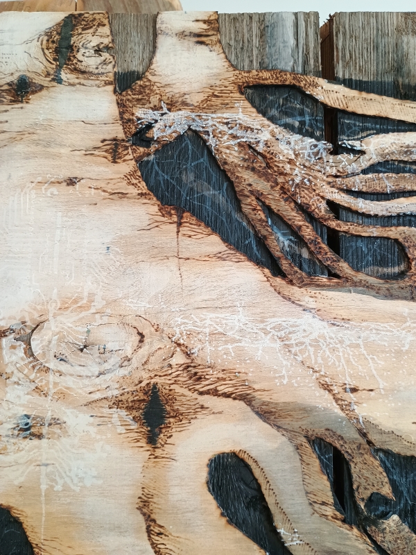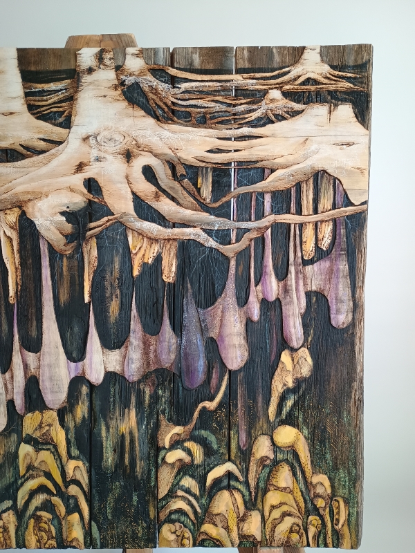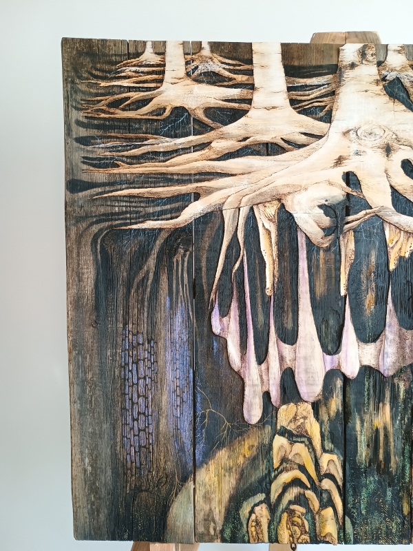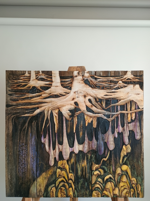 Wood Wide Web: Pohádky o Mykorhíze VI, Podpora pro Pando 2024-2025, 103x111 cm, biologicky odbouratelné třpytky, vypalovaná dýha, sítotisk, akryl, akvarel, lak a zbytky vosího hnízda na dřevěné desce