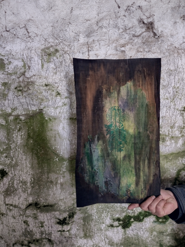 Pohled skrze ránu ven (Nectria galligena), hřebíky s octem, vosk, pigmenty, tuš a sítotisk na dýze, 30 x 50 cm, 2024