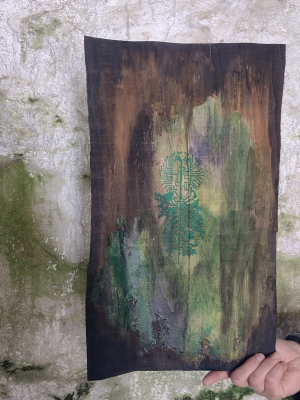 Looking through the wound (Nectria galligena), nails with vinegar, wax, pigments, ink and screen printing on veneer, 30 x 50 cm, 2024