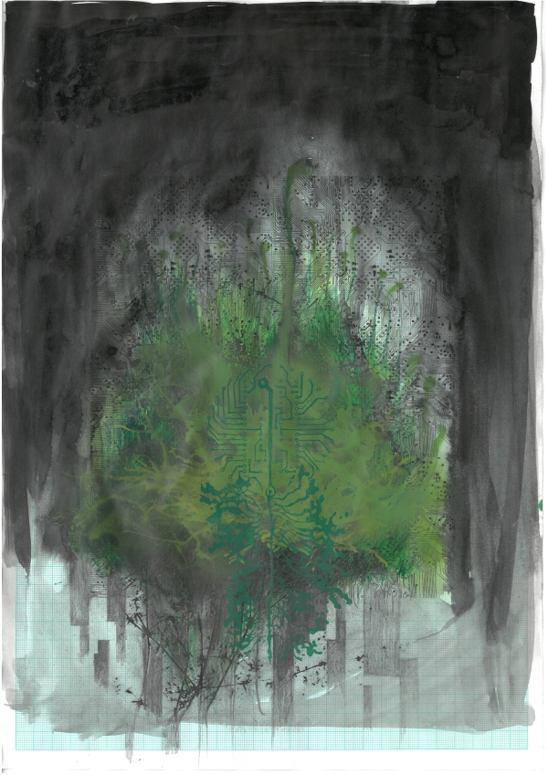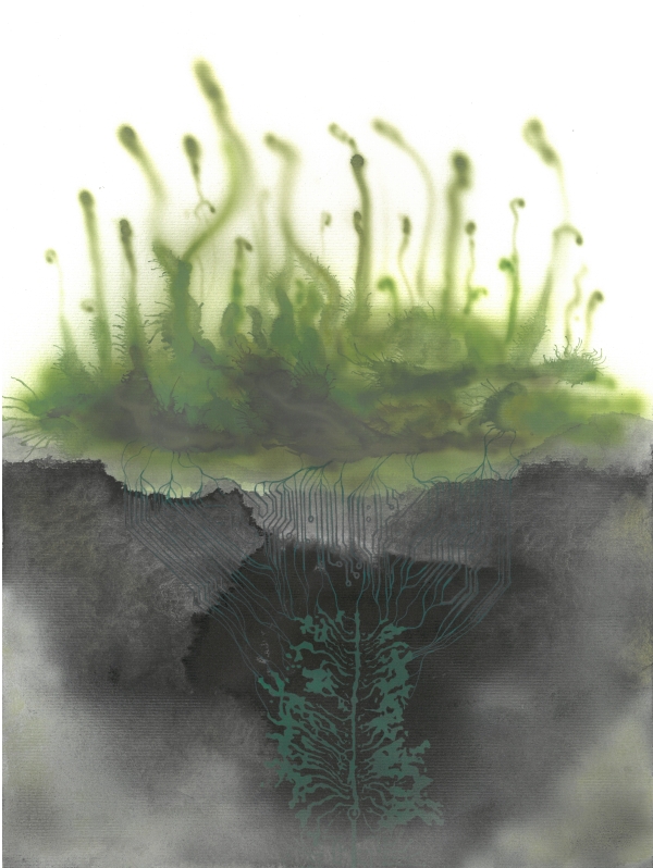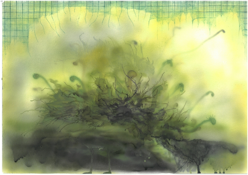 Představy o symbiotických spojeních II, 2024, akryl, airbrush, propiska, tuš, voda a sítotisk na papíře 42 x 27 cm Imagination about symbiotic connections II, 2024, acrylic, airbrush, pen, ink, water and screen printing on paper 42 x 27 cm