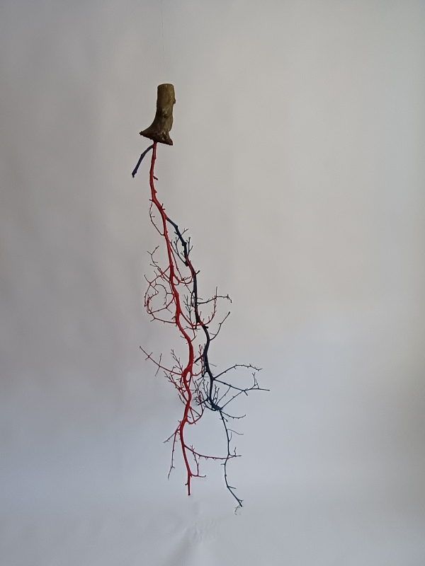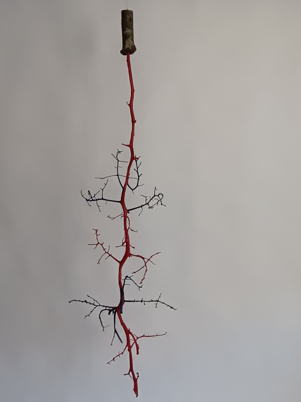 Fyziologie podzemních procesů, výška cca 160 cm, 2024, loňské rajče, dřevo, zemina, akrylová barva Physiology of underground processes, cca 160 cm high, 2024, last year tomato, wood, soil, acrylic paint