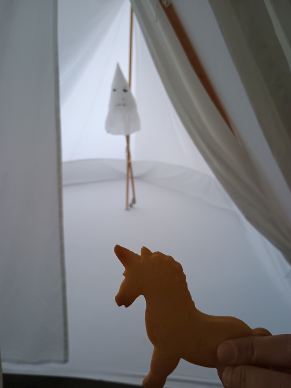 Childhood (copy of a tent, one of the few good memories), 2025, 4x2x2 m, wood, canvas, ropes, in photos from the installation in the G34 gallery Třebíč together with the Unicorn object and thematic food for the opening