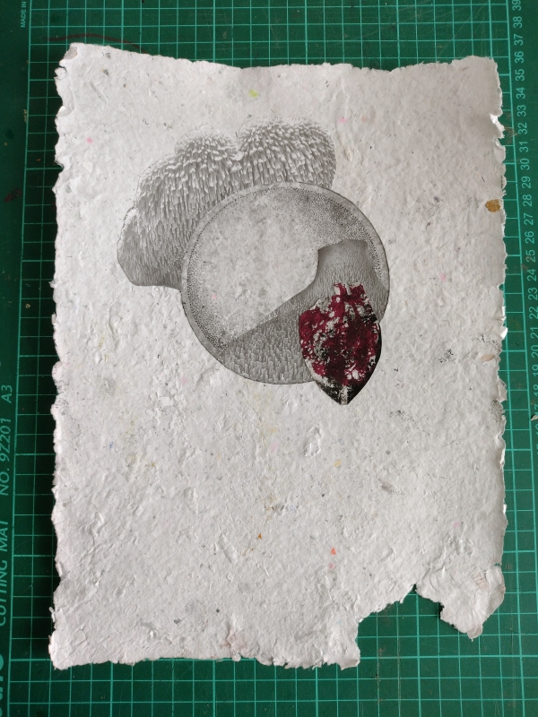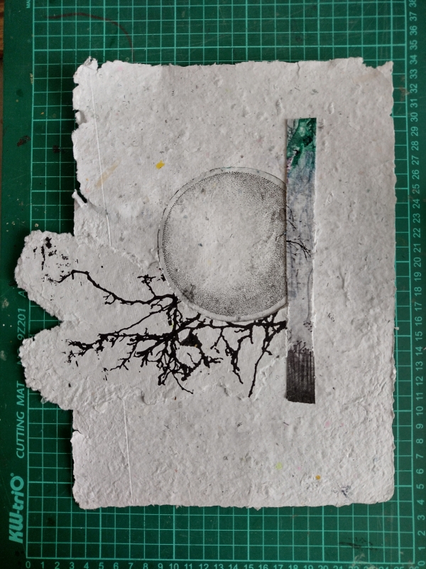 Struktury a organismy, o kterých přemýšlím, 2024, koláž, tisk z hloubky a sítotisk na ručním papíře ze skartovaných dokumentů mateřské instituce