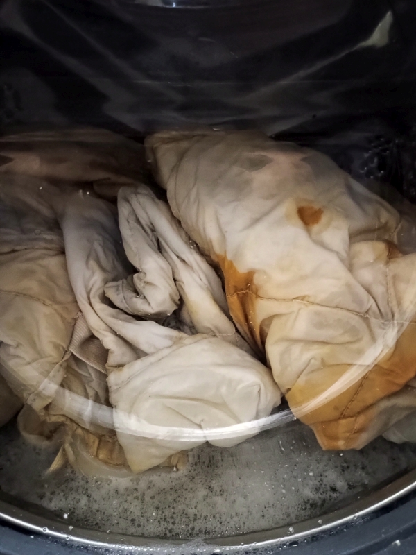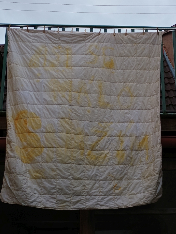Veraikon pracující matky, 2025, starý kryt matrace na dvojpostel, tekutá rez, vypráno, vyvařeno Veraicon of working mother, 2025, old mattress cover for a double bed, liquid rust, washed, boiled Video: