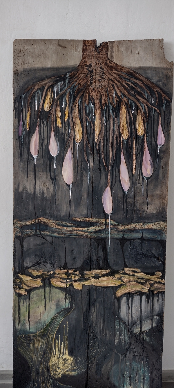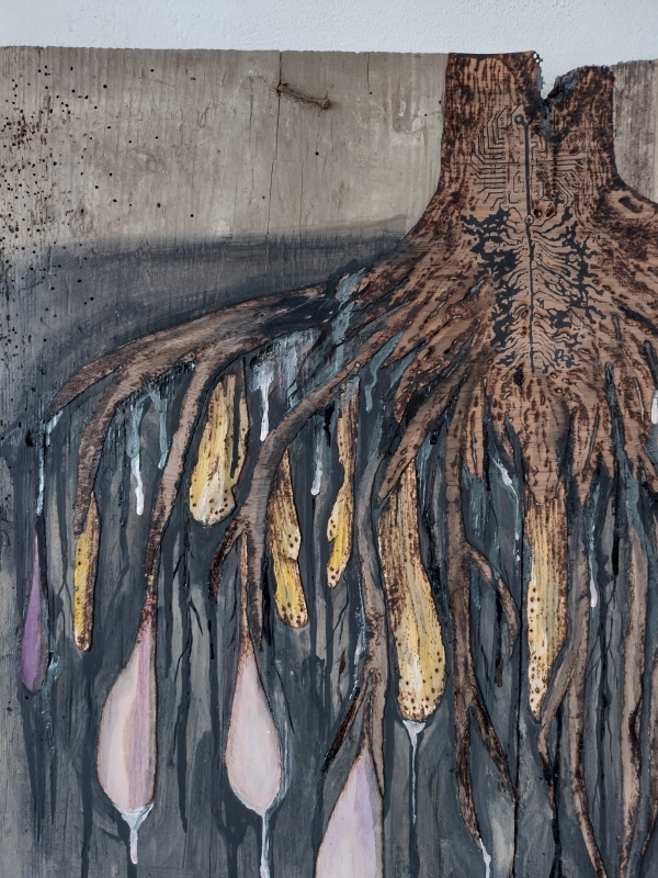 Wood Wide Web: Pohádky o Mykorhíze IV (Umírání a sdílení),2023, vypalovaná dýha, sítotisk, akryl, akvarel, třpytly, lak a zbytky vosího hnízda na dřevěné desce, výška 160 cm