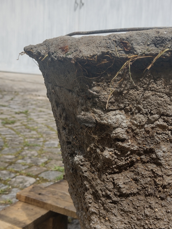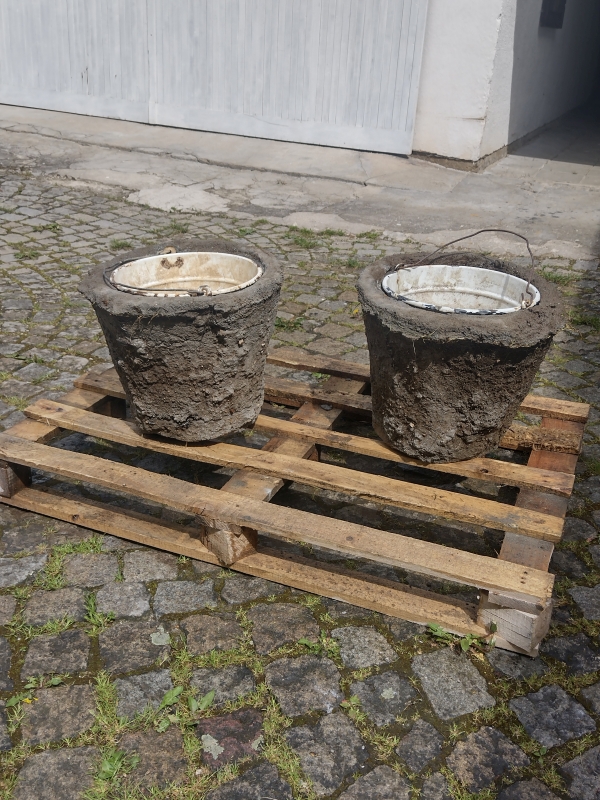 Flower pots for the exhibition in the packaging-free Opobchod (Jemnice), created without packaging (meaning without a form), concrete, 2024