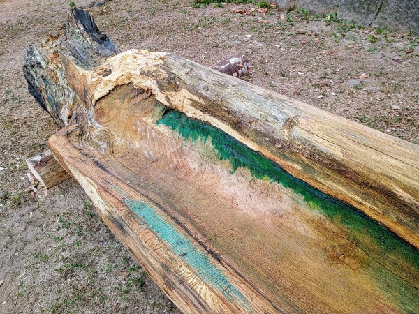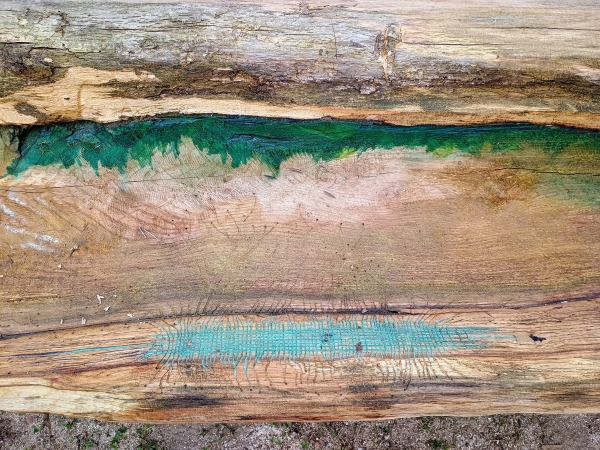 Pocta tlení aka variace na téma lavička na řezbářském sympoziu, dub, airbrush, lněný olej, pigmenty, délak cca 2m, 2024