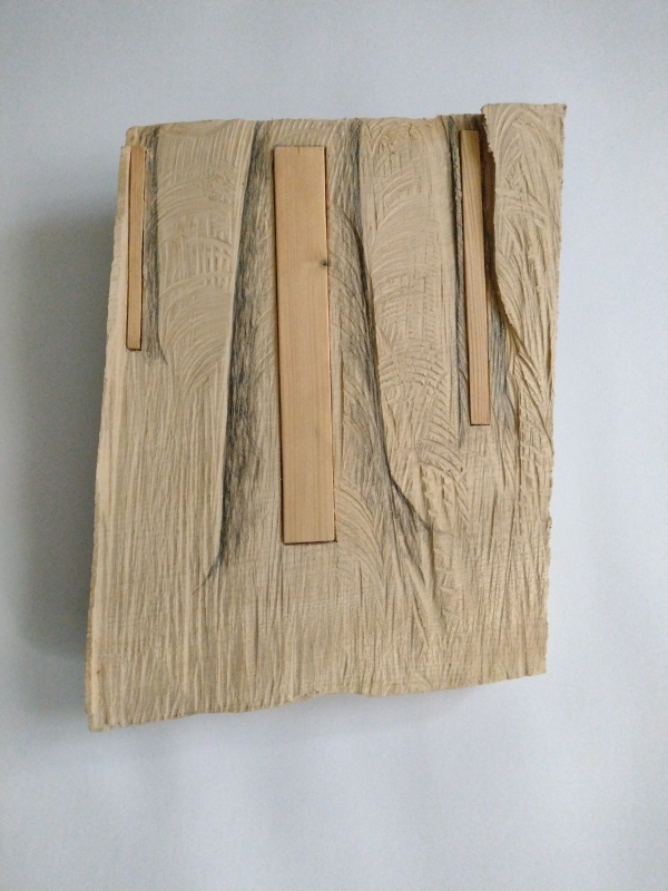 Pro dřevo nevidí stromy, 32x26x3 cm, nalezené dřevo, kresba tužkou, 2023 Can't see the trees for the wood, 32x26x3 cm, found wood, pencil drawing, 2023