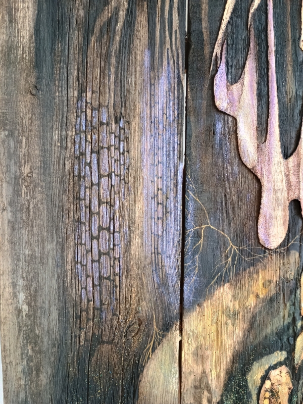 Wood Wide Web: Pohádky o Mykorhíze VI, Podpora pro Pando 2024-2025, 103x111 cm, biologicky odbouratelné třpytky, vypalovaná dýha, sítotisk, akryl, akvarel, lak a zbytky vosího hnízda na dřevěné desce