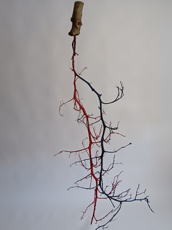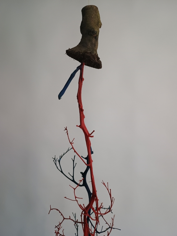 Fyziologie podzemních procesů, výška cca 160 cm, 2024, loňské rajče, dřevo, zemina, akrylová barva Physiology of underground processes, cca 160 cm high, 2024, last year tomato, wood, soil, acrylic paint