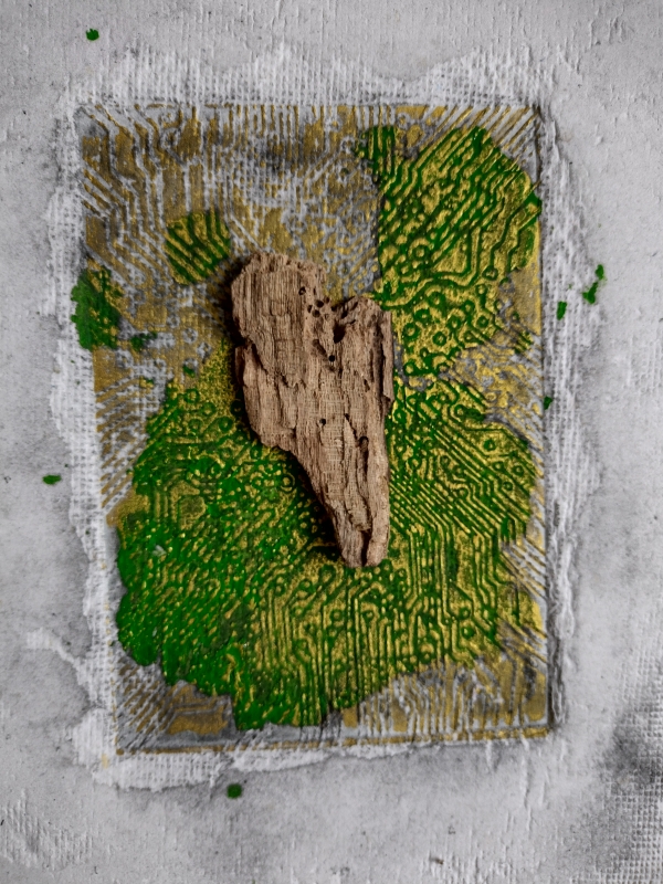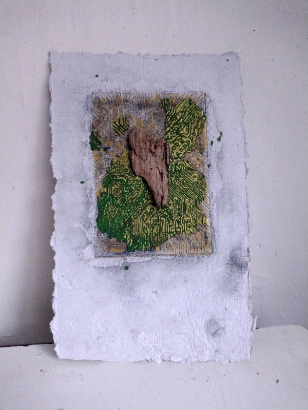 Relikviář, 18x28 cm, 2024, ruční papír, vosk, slepotisk, linoryt, relikvie lesa Reliquary, 18x28 cm, 2024, handmade paper, wax, blind print, linocut, forest relic