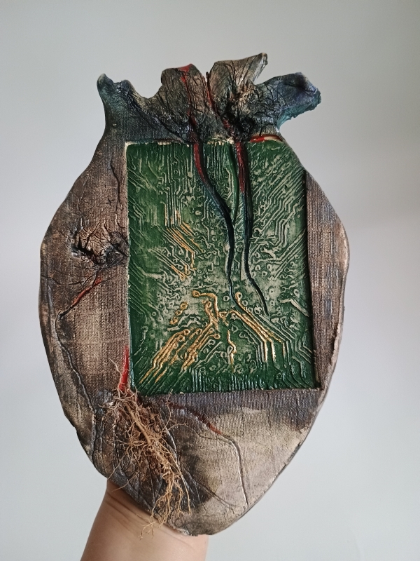Velkokapacitní enviromentální sensor, 2024, glazovaná keramika, oxidy, plátkové zlato, kořeny cínie, tak akorát do ruky FLarge-capacity environmental sensor, 2024, glazed ceramics, oxides, gold leaf, zinnia roots, just right for your hand