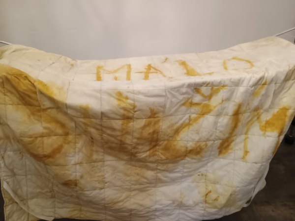 Veraikon pracující matky, 2025, starý kryt matrace na dvojpostel, tekutá rez, vypráno, vyvařeno Veraicon of working mother, 2025, old mattress cover for a double bed, liquid rust, washed, boiled Video: